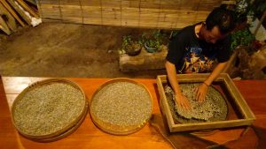 Proses berikutnya adalah grading menggunakan ayakan yaitu mengelompokkan biji sesuai ukuran besar, sedang dan kecil. Dilanjutkan pada proses sortasi yakni memilah biji utuh, pecah, hitam dan bahan lain selain biji kopi seperti plastik, kerikil, ranting dan lainnya.